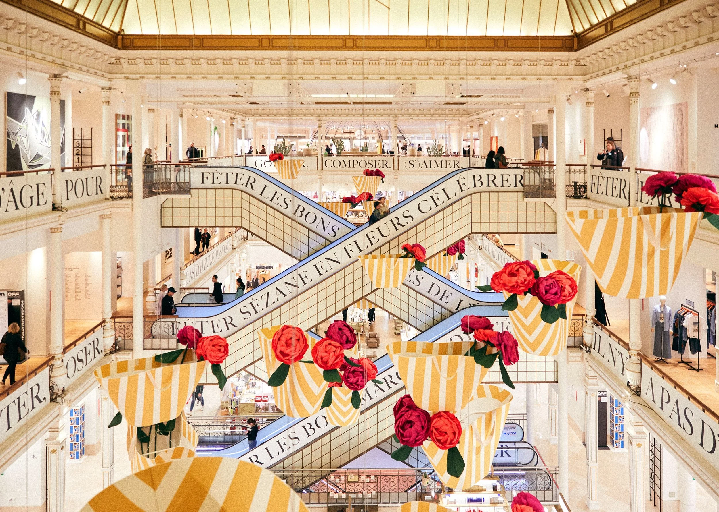 Réalisation de têtes de pivoines géantes pour la décoration du hall du Bon Marché