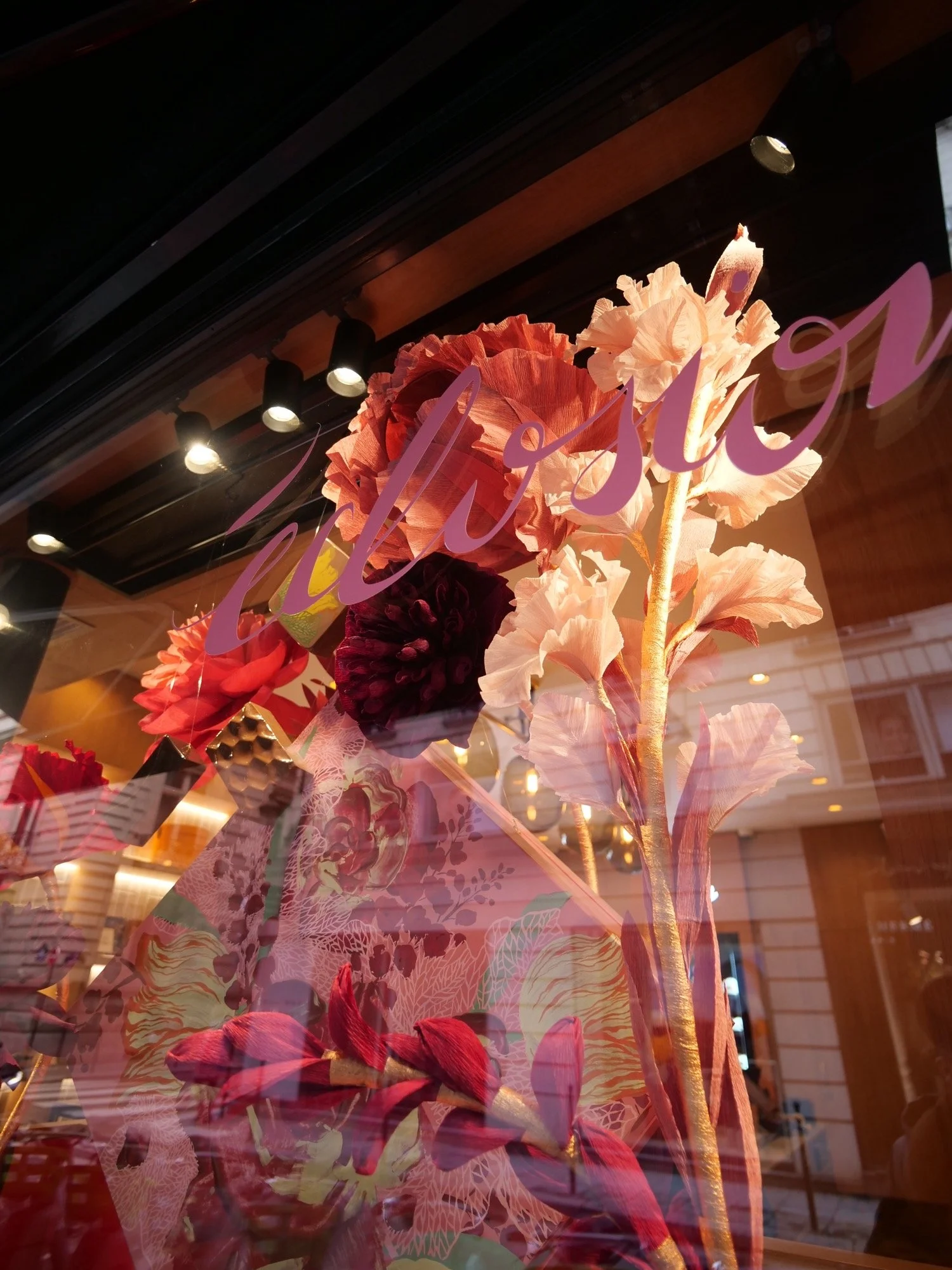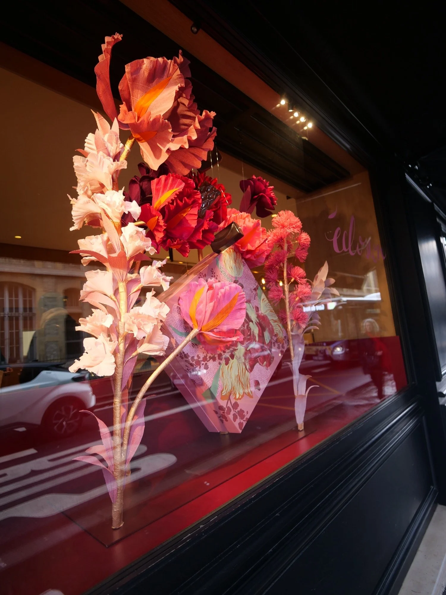 Réalisation de compositions florales géantes en papier · Charte graphique et camaïeux inspirées des illustrations de Yukiko Noritake présentes sur les coffrets.